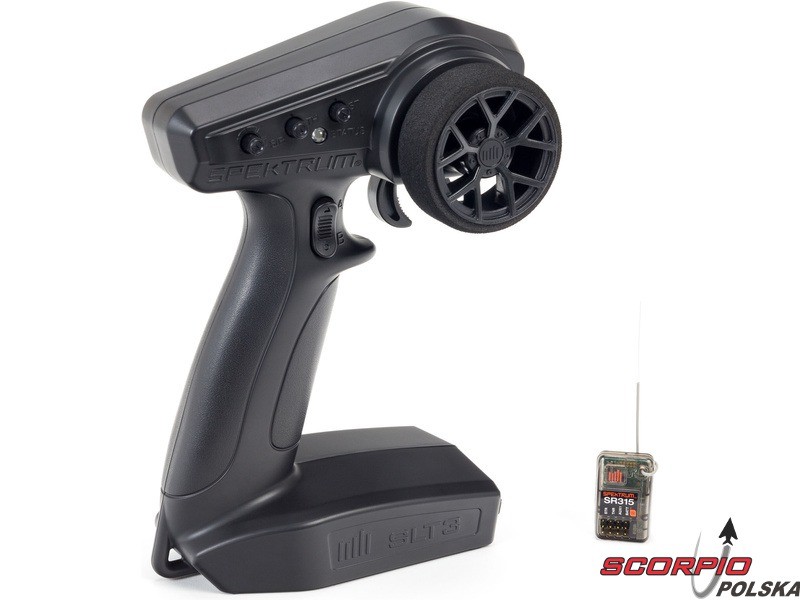 Podstawowy 3-kanałowy nadajnik pistoletowy Spektrum SLT3 pracujący w paśmie 2.4GHz kompatybilny z protokołem SLT™. Niska masa nadajnika Spektrum SLT3 umożliwia trzymanie bez zmęczenia. Kierownica pokryta jest piankową obręczą zapewniającą pewny chwyt. Układ elementów sterujących jest praktyczny i intuicyjny - wszystkie elementy sterujące są rozmieszczone tak, aby były szybko dostępne w razie potrzeby. Dostępna jest bezpieczna pętla do mocowania do paska.