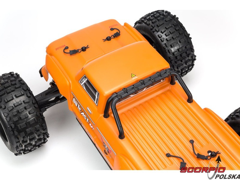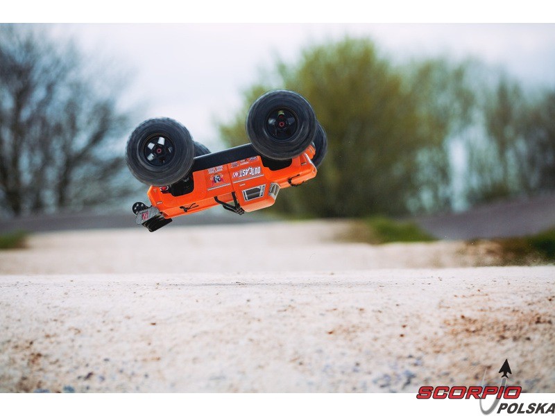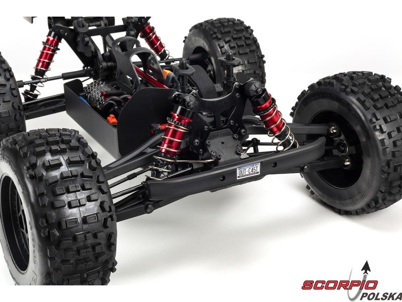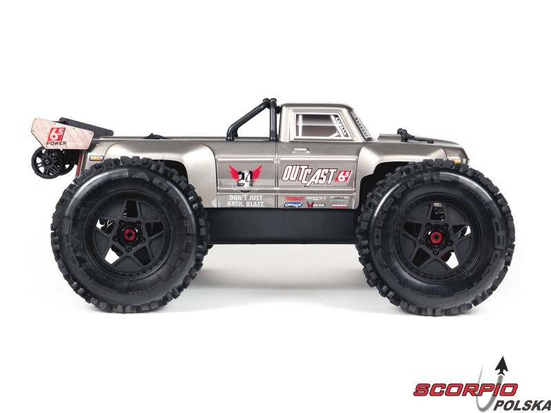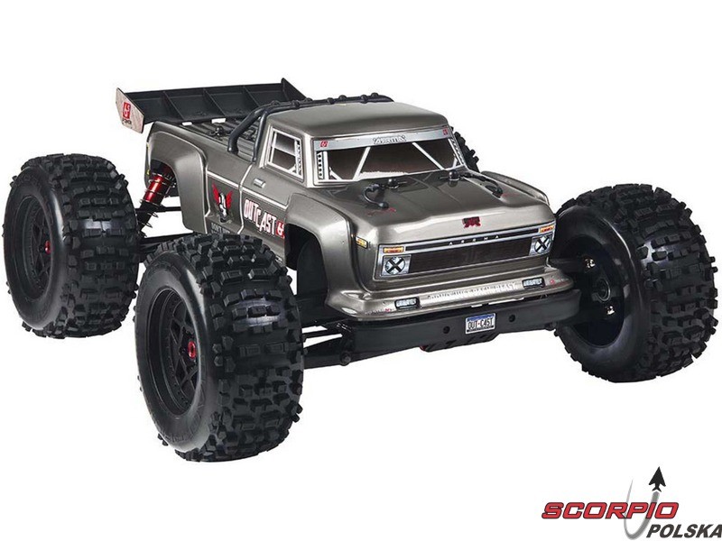 Masz ochotę wjechać na tor Off-road z mocnym autem? Arrma Outcast spełni twoje wymagania. Jazda na tylnych kołach, przewroty w czasie skoków, agresywna jazda. Rozpakujcie gotowe i złożone wraz z nadajnikiem Spektrum STX2 2,4GHz. Auto ma gotową pomalowaną karoserię, a koła mają naklejone opony. Zestaw nie zawiera akumulatora oraz ładowarki, dlatego należy uzupełnić zestaw o swoje sprawdzone 2 szt. akumulatorów LiPol min. 5000mAh 35C 2 lub 3s, aby weszły do komory akumulatora o wymiarach 158x48x70mm. Model z napędem 4WD ma nowoczesna kompaktową konstrukcję podwozia, gdzie płyta bazowa wykonana jest z duralu o gr. 3mm oraz bardzo wytrzymałych stalowych i kompozytowych materiałów. Napędza go trójfazowy silnik BLX4074 2050kv oraz trójfazowy regulator BLX185 150A 4-6S.