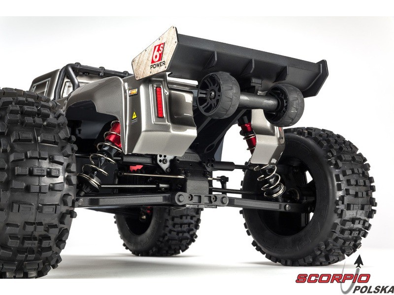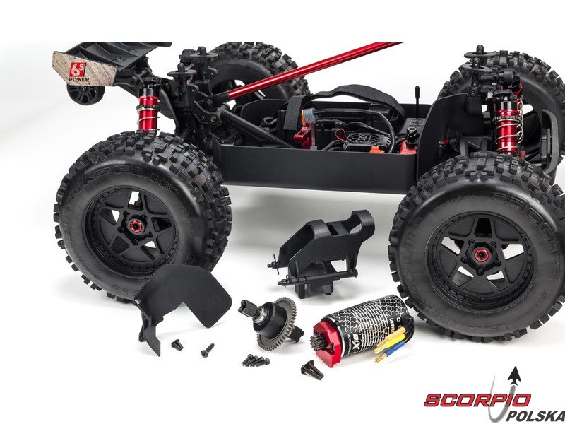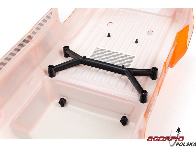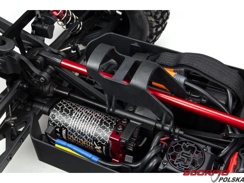 Na podwoziu jest zainstalowana wanna ochrona, która jest w stanie w większym stopniu ochronić elektronikę modelu przed prochem i nieczystościami. Bardzo wytrzymałe opaski pewnie mocują akumulator na swoim miejscu bez względu na styl jazdy. Napęd 4WD na wszystkie koła jest przenoszony na stalowe półosie w przedniej, tylnej i środkowej części przez dyferencjały z metalowymi kołami zębatymi.