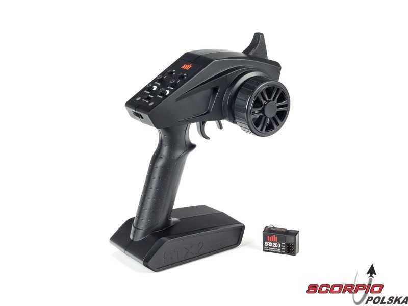 2-kanałowy pistoletowy nadajnik Spektrum STX200 2,4 GHz FHSS ze zintegrowaną anteną, prostym i szybkim ustawieniem dla początkujących. Pamięć na 1 model, Ustawienie rewersów, subtrymerów, końcowych punktów, limitu gazu 50%, 75% i 100%.