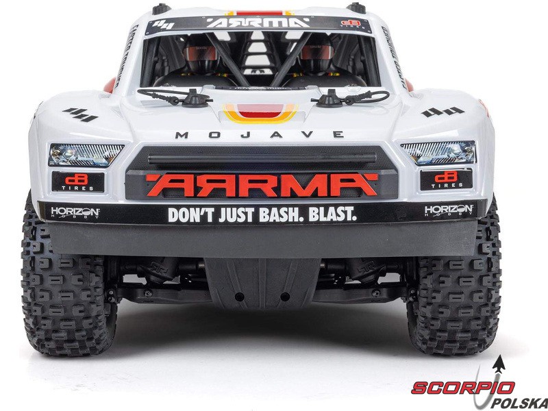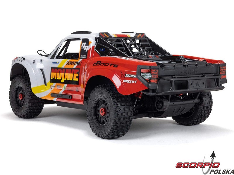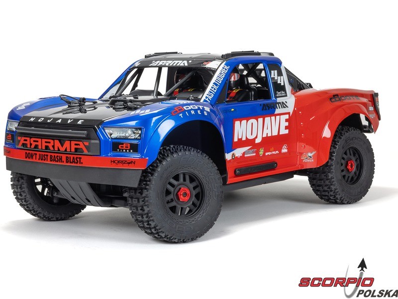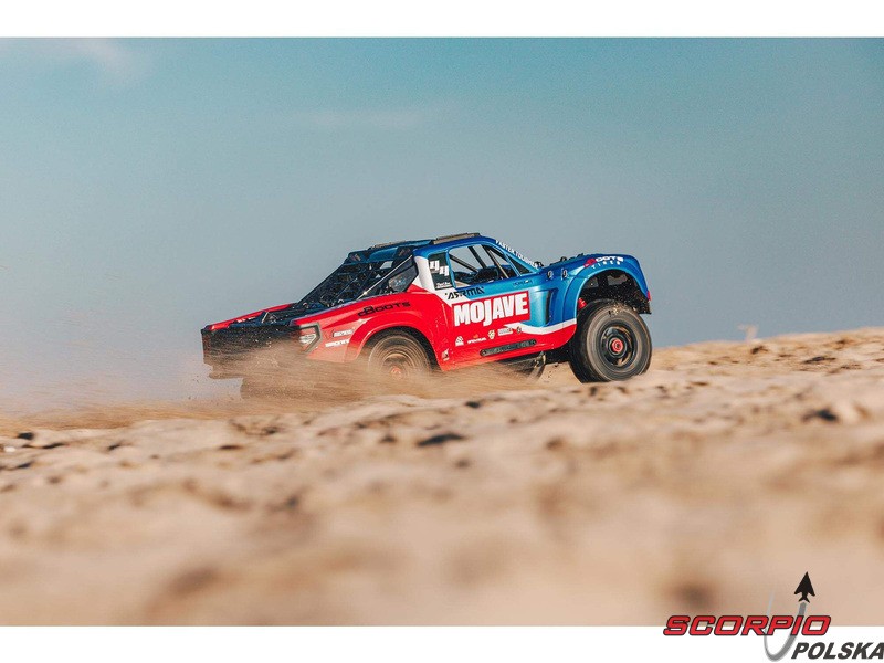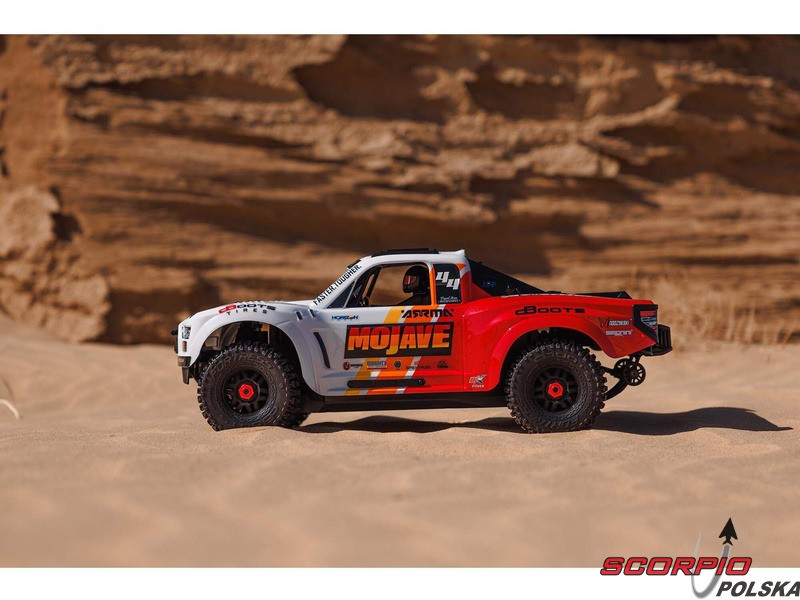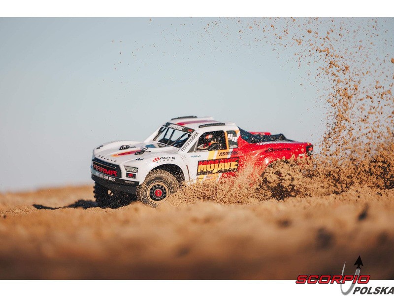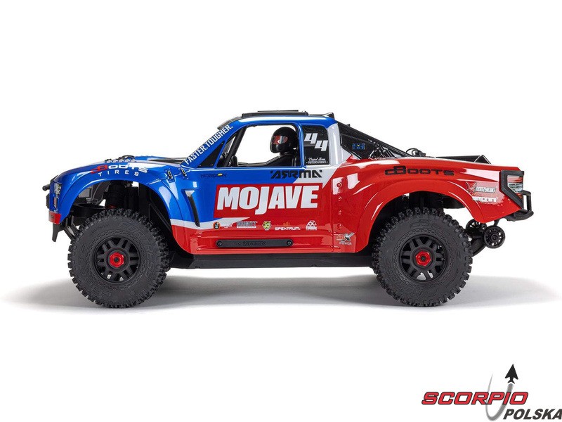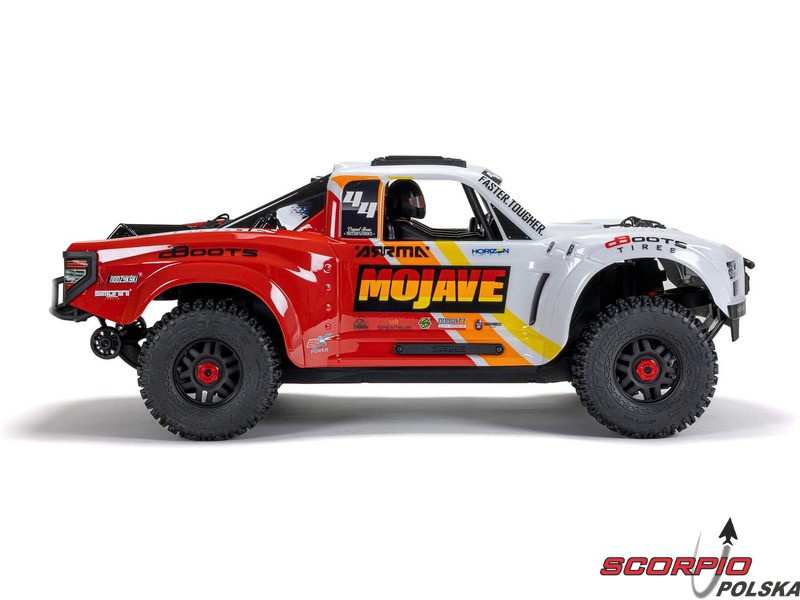 Model RC Arrma Mojave 4S w skali 1:8 jest idealnym pośrednikiem między mniejszym 3S a większym 6S. Dzięki doskonałemu napędowi trójfazowemu może osiągnąć prędkość do 80 km/h. Napęd 4x4 i najnowocześniejsze zawieszenie gwarantują niezrównane prowadzenie. Wszystko to jest opakowane w realistyczną karoserię pustynnego samochodu wyścigowego ze szczegółowym kokpitem, klatką bezpieczeństwa i relingami dachowymi.