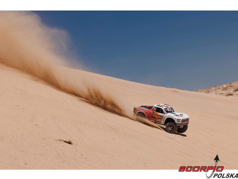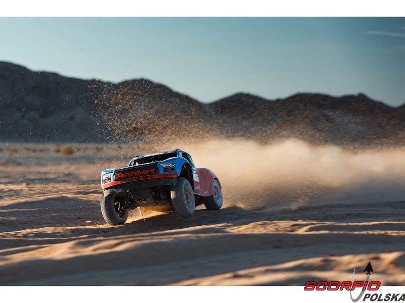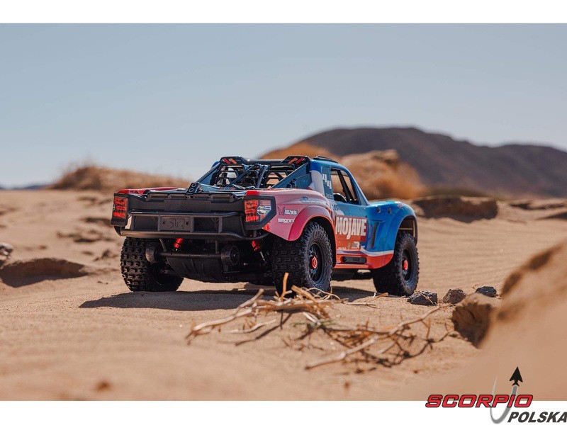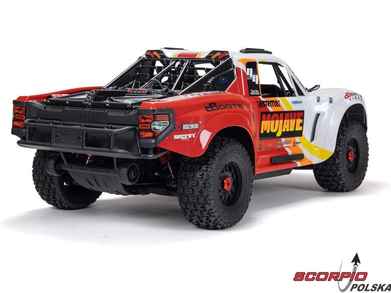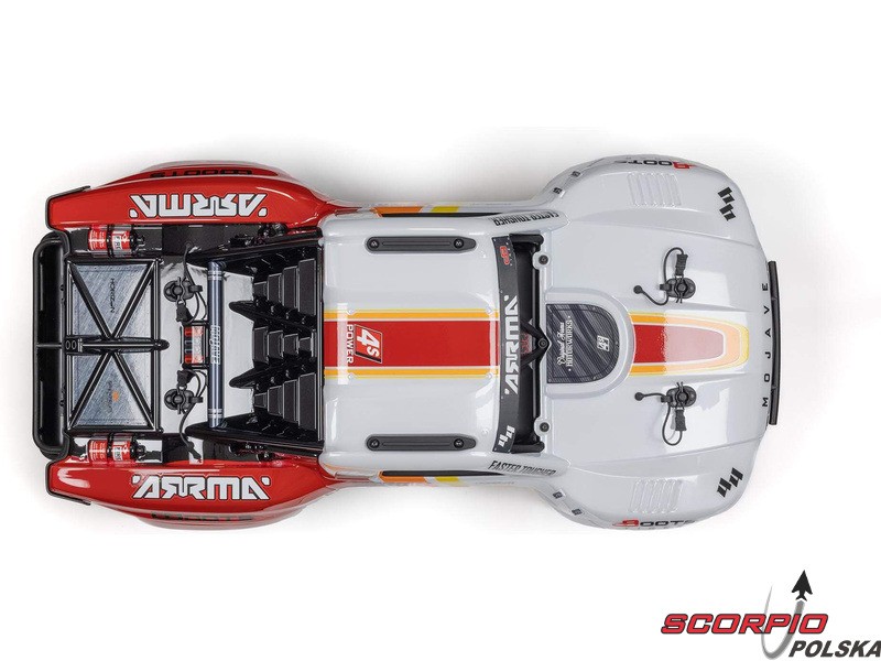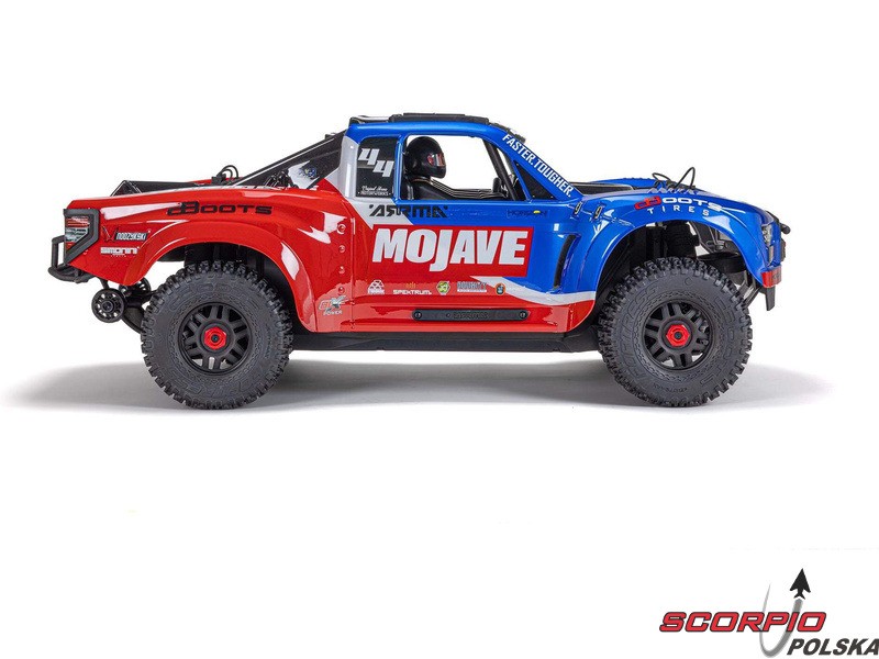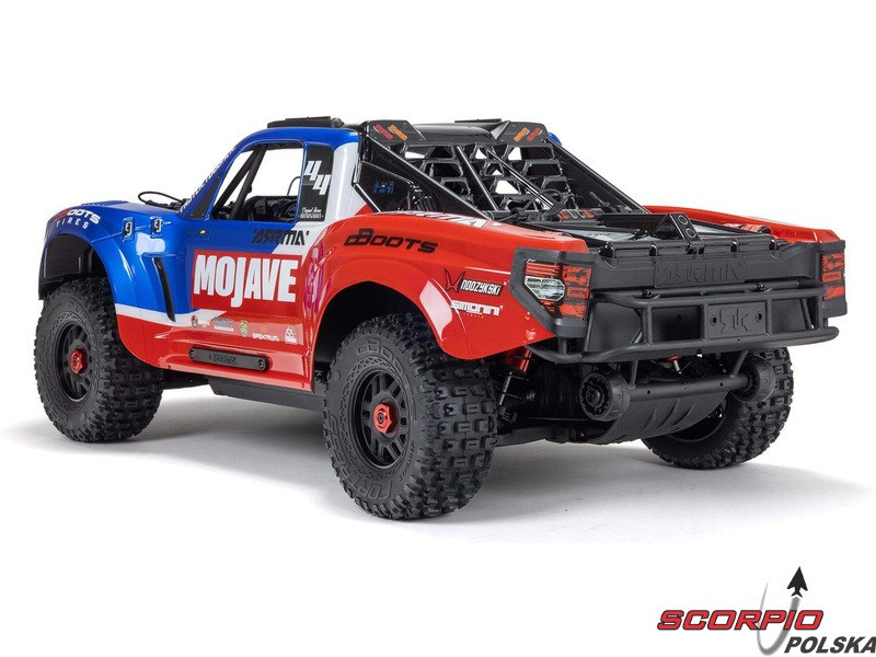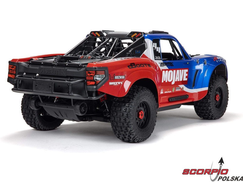 Model RC Arrma Mojave 4S w skali 1:8 jest idealnym pośrednikiem między mniejszym 3S a większym 6S. Dzięki doskonałemu napędowi trójfazowemu może osiągnąć prędkość do 80 km/h. Napęd 4x4 i najnowocześniejsze zawieszenie gwarantują niezrównane prowadzenie. Wszystko to jest opakowane w realistyczną karoserię pustynnego samochodu wyścigowego ze szczegółowym kokpitem, klatką bezpieczeństwa i relingami dachowymi.