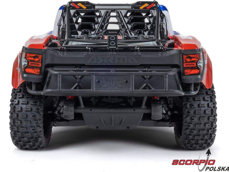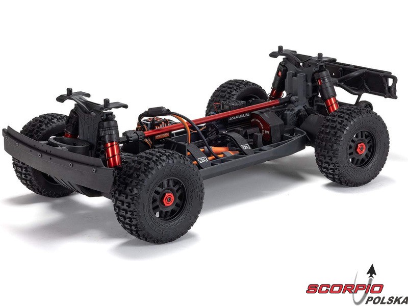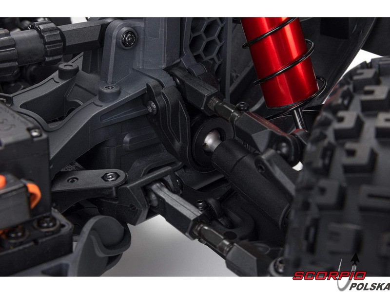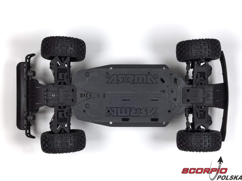 Niesamowite przyspieszenie i prędkość zapewnia bezszczotkowy silnik Spektrum 2400kv i regulator obrotów Spektrum Firma 120A. Wytrzymałe kompozytowe podwozie i przekładnia, wzmocnione częściami EXB (EXtreme Bash), nadają modelowi niesamowitą trwałość charakterystyczną dla marki Arrma. Nowy centralny dyferencjał jest używany na platformie Arrma 4S dla niesamowitej trakcji i prowadzenia.