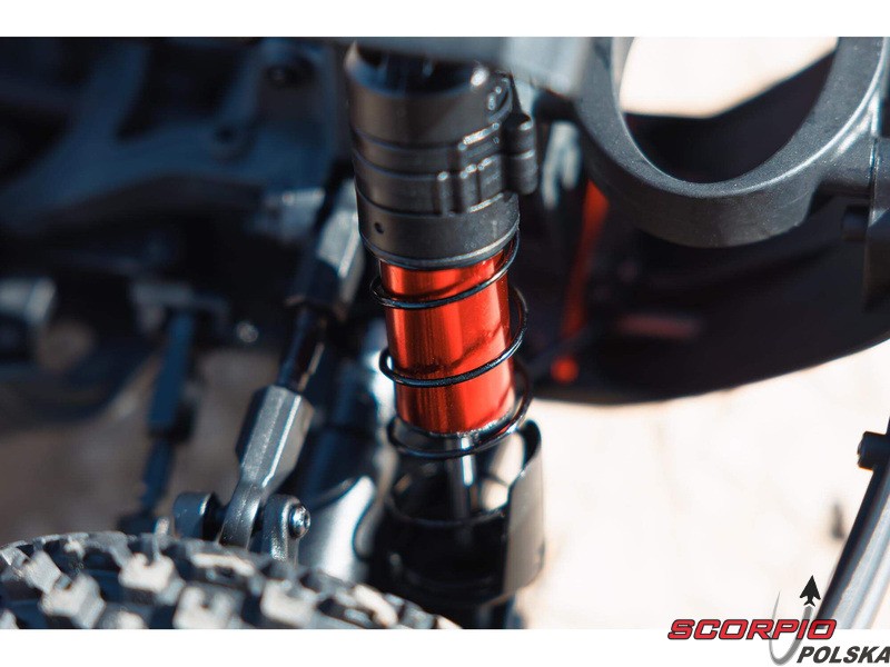 Długie aluminiowe amortyzatory są wypełnione olejem i zamontowane na wyższych wieżach amortyzatorów. Zapewnia to skuteczne pochłanianie nawet silnych uderzeń.