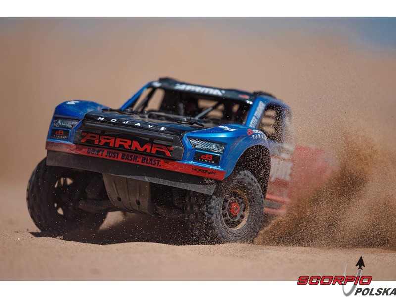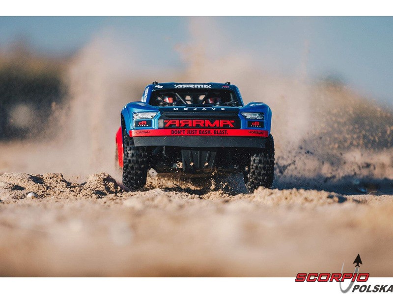RC model pustynnego samochodu wyścigowego - Arrma Mojave 4S BLX 1:8 RTR z silnikiem bezszczotkowym, rozwija prędkość do 80 km/h. Wytrzymałe kompozytowe podwozie, układ napędowy z nowym centralnym mechanizmem różnicowym, szczegółowa karoseria, aluminiowe komponenty, amortyzatory olejowe. Wysokiej klasy elektronika Spektrum.