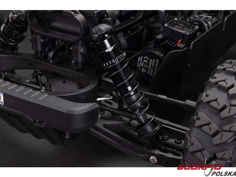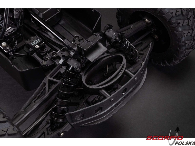 Anodowane na czarno aluminiowe podwozie 6061-T6 i niezależne zawieszenie z regulowanymi aluminiowymi amortyzatorami olejowymi są zainstalowane w bardzo wytrzymałym modelu, który poradzi sobie w każdym terenie. Poszczególne elementy, takie jak metalowy układ napędowy, stalowe wały i nowy cyfrowy serwomechanizm Spektrum S665 z metalowymi zębatkami, współpracują ze sobą, aby wykorzystać pełny potencjał trójfazowego napędu 6S.
