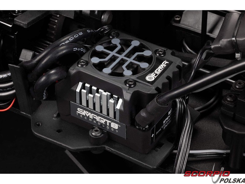 Układ napędowy modelu RC z obsługą akumulatorów 6S LiPo zawiera wysokowydajny silnik bezszczotkowy Spektrum Firma™ 2050Kv, który jest idealnie dopasowany do wodoodpornego* regulatora Spektrum Firma 150A Smart V2 ze złączami IC5.W modelu zastosowano nowy regulator, który zapewnia większą siłę uderzenia i lepsze wyczucie jazdy.Na twardych płaskich powierzchniach można użyć dołączonej opcjonalnej zębatki, aby osiągnąć maksymalną prędkość.