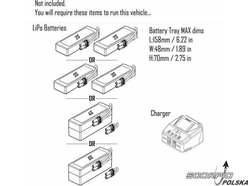 Do uruchomienia modelu potrzebne są 4x baterie AA do nadajnika, akumulator napędowy oraz adekwatna ładowarka akumulatora napędowego.