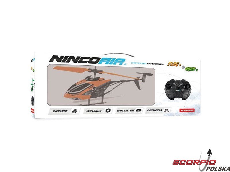 W opakowaniu znajduje się kompletnie złożony śmigłowiec na zdalne sterowanie NINCOAIR Flog 2, nadajnik IR, wbudowany akumulator LiPol 3.7V 75mAh.