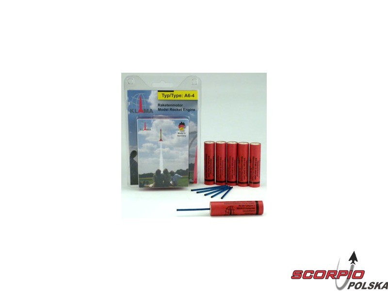 Opakowanie zawiera 6 silników rakietowych Klima A6-4 wraz z zapalnikami i instrukcją obsługi.