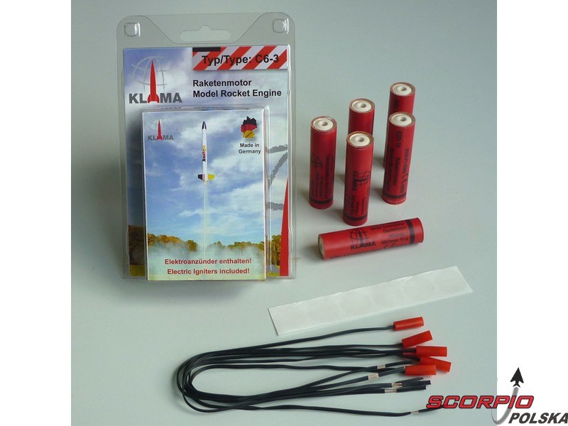 Opakowanie zawiera 6 silników rakietowych Klima C6-3 EL wraz z zapalnikami elektrycznymi, instrukcje użytkowania.