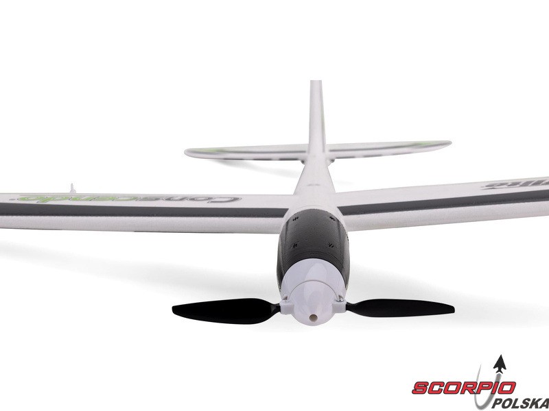 UMX Conscendo to sportowy motoszybowiec akrobacyjny z łatwym i niezwykle przyjemnym lataniem. Można latać z akumulatorem Lipol 2S 300mAh jako zwykły motoszybowiec, z wystarczającą mocą do wznoszenia się, a następnie szybowania bez silnika. Jeśli jednak zostanie użyty Lipol 3S, baranek zamieni się w dzikiego Hotlinera, z nieograniczoną mocą do wznoszenia i dzikich akrobacji. Wzmocniony kompozytem płatowiec EPS ma wytrzymałość i sztywność, która jest potrzebna. UMX Conscendo jest łatwy do startu, latania i lądowania, wyposażony w ekskluzywną 3-osiową elektroniczną stabilizację AS3X i opcjonalną ochronę obwiedni lotu SAFE Select. Dodatkowo, można opcjonalnie użyć flaperonów jako klap, aby uzyskać jeszcze więcej opcji! Co najlepsze, UMX Conscendo jest całkowicie zmontowany fabrycznie i prawie gotowy do lotu zaraz po wyjęciu z pudełka. Wystarczy zamontować skrzydło za pomocą jednej śruby bagnetowej, zainstalować naładowany akumulator, sparować model z ponad 5-kanałowym nadajnikiem Spektrum z modulacją DSMX lub DSM2 i można latać!