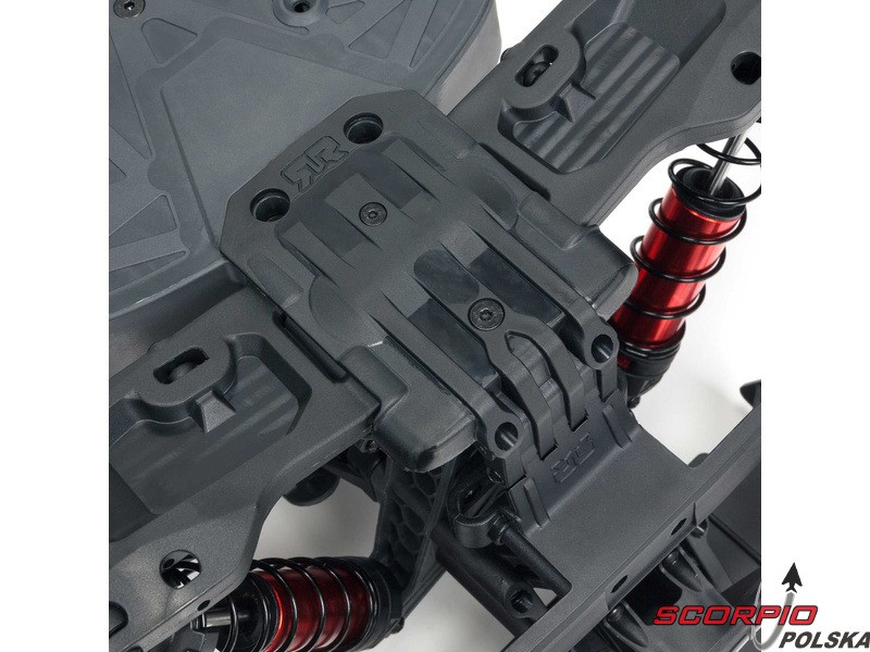 Elementy, które przyczyniają się do wysokiej wytrzymałości Arrmy 4X4 4S BLX to m.in. mocniejsze kompozytowe podwozie, przednie i tylne ślizgi ochronne, układ kierowniczy z odpornym serwo saverem, sprzęgło cierne i łożyska kulkowe w całym układzie napędowym. Podniesione ściany boczne podwozia ograniczają wnikanie zanieczyszczeń do wnętrza modelu. Przednie i tylne zderzaki skutecznie amortyzują uderzenia.