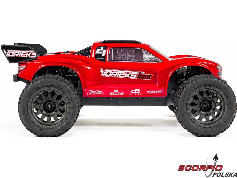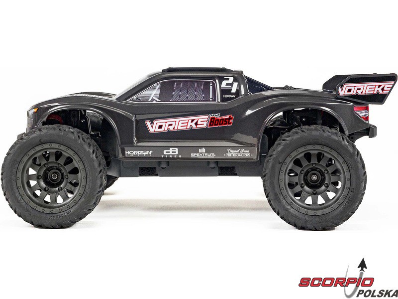 Model Vorteks™ 4X2 BOOST 550 MEGA Brushed 2WD RC w zestawie z nadajnikiem Spektrum™ SLT2™ i odbiornikiem SLT™ 2 w 1 z regulatorem 40A. Nadajnik jest ergonomicznie zaprojektowany do długiej, niemęczącej jazdy i posiada piankową kierownicę dla precyzyjnego sterowania opuszkami palców. Nowi kierowcy będą mogli ustawić limity otwarcia przepustnicy na 50% lub 75%, dopóki nie będą gotowi uwolnić swojego pełnego potencjału prędkości. Masywne, wieloramienne, czarne koła MT z wentylowanymi oponami dBoots® Fortress™ KATAR™ zapewniają Vorteksowi™ 4X2 BOOST 550 MEGA Brushed 2WD skuteczną trakcję podczas jazdy po niemal każdym terenie - w tym off-road, dirt, trawa, parkingi i asfalt.