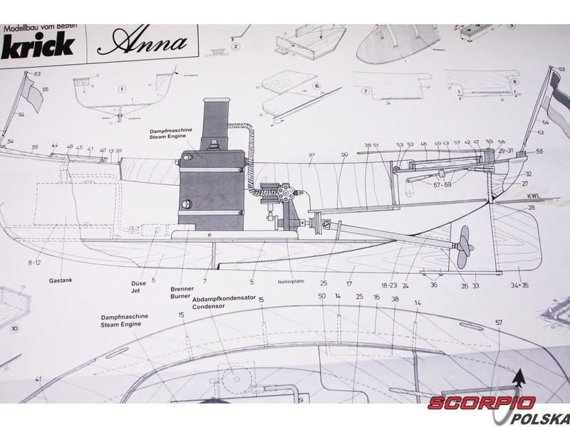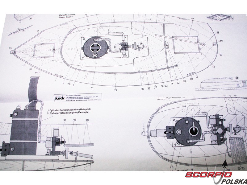 Zestaw zawiera kompletny zestaw rysunków modelu w skali 1:1 wraz ze zdjęciami poszczególnych detali. Rysunki przedstawiają zespoły i ich montaż, w tym zespół silnika parowego. Wielojęzyczna procedura konstrukcyjna stanowi ramy logicznego montażu poszczególnych komponentów.