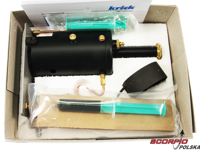 Po otwarciu wieka pudełka znajdziemy kadłub ABS, parowóz V2 Krick z podkładką izolacyjną, drewniane części modelu ze sklejki, zestaw listew, małe elementy zapieczętowane w woreczkach, zestaw rysunków i instrukcję.
