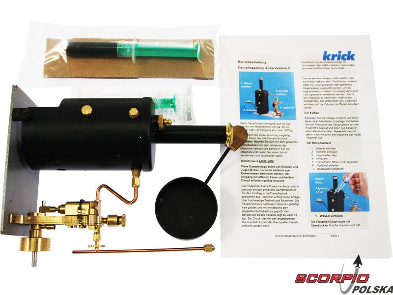 Do uruchomienia zestawu łodzi Anna wyposażonego w silnik parowy z kotłem stojącym zalecany jest olej do silników parowych 60ml. Silnik parowy V2 to jednokierunkowy cylinder z lutowanym mosiężnym kotłem, który jest ogrzewany przez zapaloną kostkę suchego alkoholu Esbit Czas spalania wynosi około 12 minut dla kostki 14g. W zestawie z maszyną parową znajduje się podkładka termoizolacyjna. To ciekawe wizualnie urządzenie ma solidną wydajność i napędza parowiec Anna z przyzwoitą prędkością. Silnika parowego nie da się regulować. Statek jest sterowany tylko przez ster.