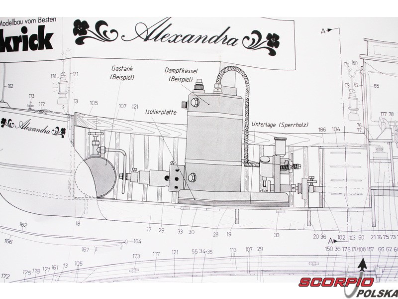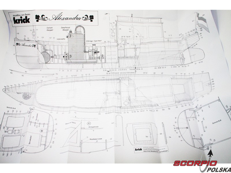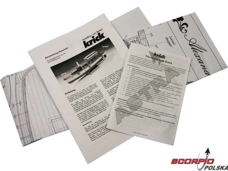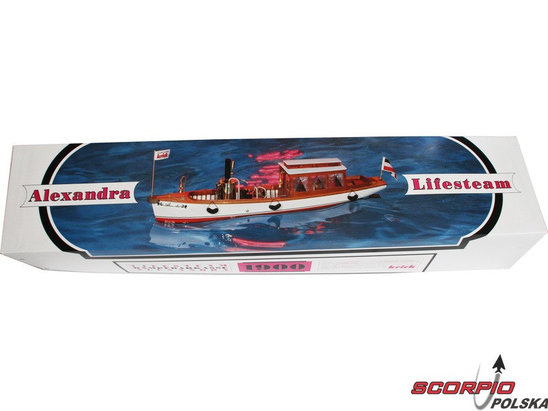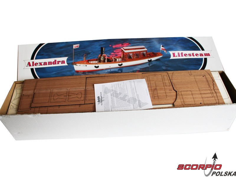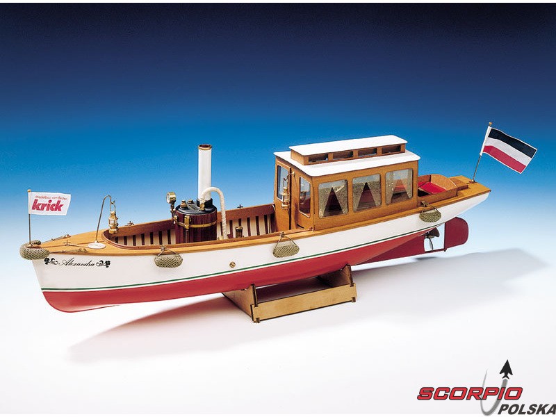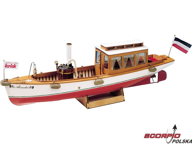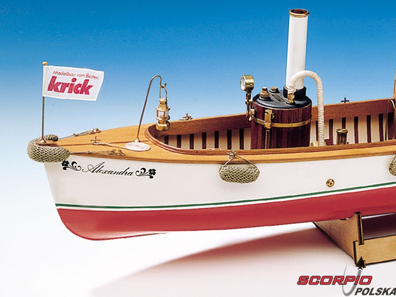 Zestaw modelu w skali 1:10 łodzi parowej Krick Alexandra. Ten typ łodzi był używany na początku ubiegłego wieku. Alexandra to idealny model do wejścia w świat pary. Konstrukcja składa się z laserowo wycinanych drewnianych części i gotowego kadłuba z ABS. Budowa nie wymaga żadnej specjalnej wiedzy. Zestaw nie zawiera silnika parowego.