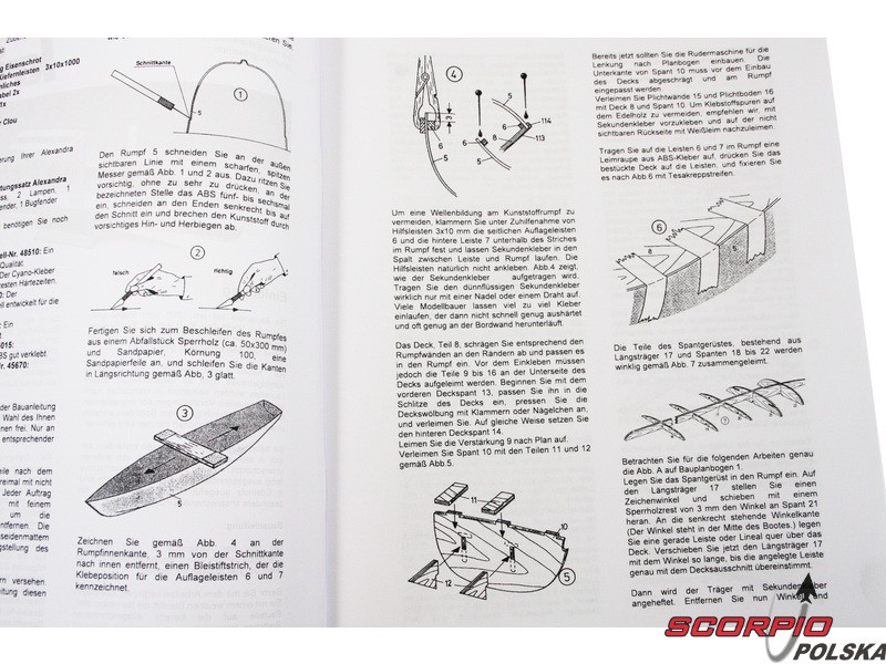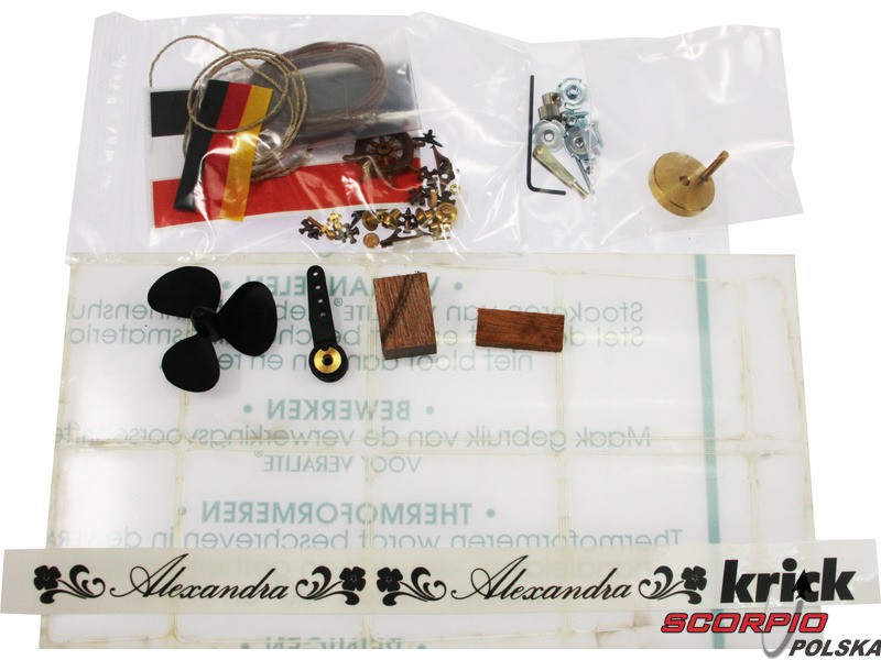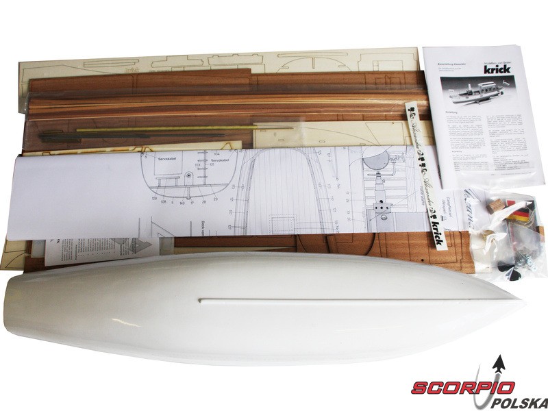 Zestaw Krick Alexandra zawiera plastikowy kadłub z tworzywa ABS, drewniane części pokładu, części montażowe, niemiecki podręcznik i instrukcję obsługi.