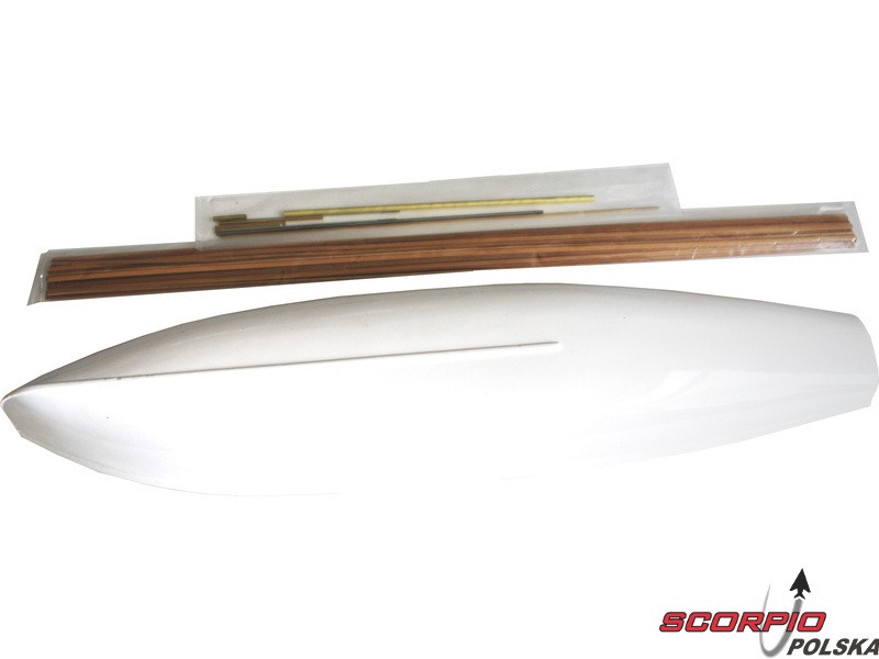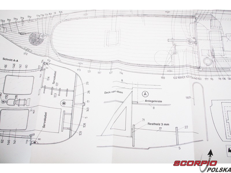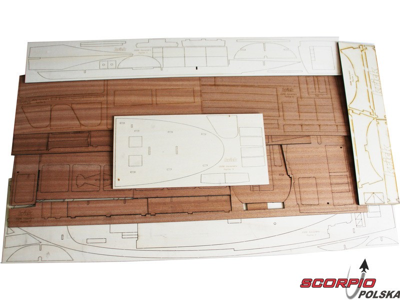 Po otwarciu wieka pudełka znajdziemy plastikową wypraskę kadłuba ABS, drewniane części modelu wykonane ze sklejki, zestaw wyprasek, małe części zamknięte w woreczkach, zestaw rysunków i instrukcję.