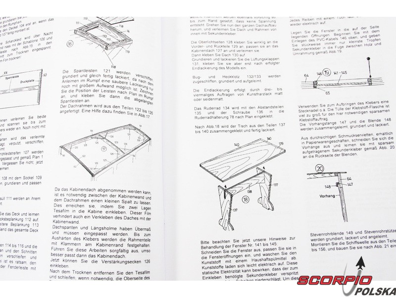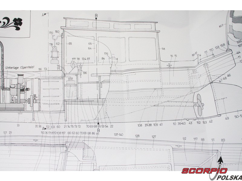 Zestaw zawiera komplet rysunków modelu w skali 1:1 wraz ze zdjęciami poszczególnych detali. Rysunki pokazują zespoły montażowe i ich złożenie, w tym zespół silnika parowego. Wielojęzyczna procedura budowy przedstawia logiczny montaż poszczególnych elementów.